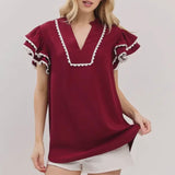 Crimson & White Scalloped Blouse (RTS)